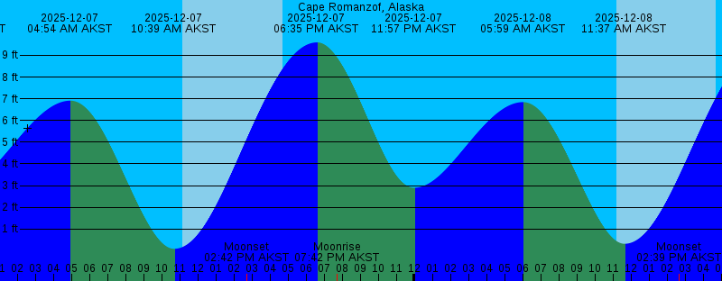 2025-12-06 10:59 PM AKST 3.09 feet Low Tide 2025-12-07 04:54 AM AKST 6.91 feet High Tide 2025-12-07 10:39 AM AKST 0.09 feet Low Tide 2025-12-07 11:09 AM AKST Sunrise 2025-12-07 02:42 PM AKST Moonset 2025-12-07 04:42 PM AKST Sunset 2025-12-07 06:35 PM AKST 9.59 feet High Tide 2025-12-07 07:42 PM AKST Moonrise 2025-12-07 11:57 PM AKST 2.90 feet Low Tide 2025-12-08 05:59 AM AKST 6.84 feet High Tide 2025-12-08 11:11 AM AKST Sunrise 2025-12-08 11:37 AM AKST 0.32 feet Low Tide 2025-12-08 02:39 PM AKST Moonset 2025-12-08 04:41 PM AKST Sunset 2025-12-08 07:28 PM AKST 9.52 feet High Tide 2025-12-08 09:39 PM AKST Moonrise 2025-12-09 12:54 AM AKST 2.66 feet Low Tide 2025-12-09 07:05 AM AKST 6.80 feet High Tide 2025-12-09 11:13 AM AKST Sunrise 2025-12-09 12:34 PM AKST 0.67 feet Low Tide 2025-12-09 02:35 PM AKST Moonset 2025-12-09 04:40 PM AKST Sunset 2025-12-09 08:20 PM AKST 9.34 feet High Tide 2025-12-09 11:24 PM AKST Moonrise 2025-12-10 01:49 AM AKST 2.39 feet Low Tide 2025-12-10 08:13 AM AKST 6.78 feet High Tide 2025-12-10 11:14 AM AKST Sunrise 2025-12-10 01:32 PM AKST 1.13 feet Low Tide 2025-12-10 02:31 PM AKST Moonset 2025-12-10 04:40 PM AKST Sunset 2025-12-10 09:10 PM AKST 9.07 feet High Tide |