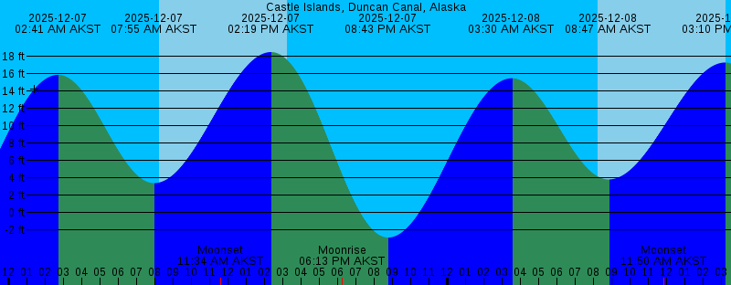 2025-12-07 02:41 AM AKST 15.85 feet High Tide 2025-12-07 07:55 AM AKST 3.39 feet Low Tide 2025-12-07 08:13 AM AKST Sunrise 2025-12-07 11:34 AM AKST Moonset 2025-12-07 02:19 PM AKST 18.47 feet High Tide 2025-12-07 03:14 PM AKST Sunset 2025-12-07 06:13 PM AKST Moonrise 2025-12-07 08:43 PM AKST -2.88 feet Low Tide 2025-12-08 03:30 AM AKST 15.46 feet High Tide 2025-12-08 08:14 AM AKST Sunrise 2025-12-08 08:47 AM AKST 3.81 feet Low Tide 2025-12-08 11:50 AM AKST Moonset 2025-12-08 03:10 PM AKST 17.27 feet High Tide 2025-12-08 03:14 PM AKST Sunset 2025-12-08 07:52 PM AKST Moonrise 2025-12-08 09:33 PM AKST -1.72 feet Low Tide 2025-12-09 04:21 AM AKST 14.97 feet High Tide 2025-12-09 08:16 AM AKST Sunrise 2025-12-09 09:45 AM AKST 4.30 feet Low Tide 2025-12-09 12:00 PM AKST Moonset 2025-12-09 03:13 PM AKST Sunset 2025-12-09 04:04 PM AKST 15.77 feet High Tide 2025-12-09 09:24 PM AKST Moonrise 2025-12-09 10:24 PM AKST -0.36 feet Low Tide 2025-12-10 05:15 AM AKST 14.50 feet High Tide 2025-12-10 08:17 AM AKST Sunrise 2025-12-10 10:49 AM AKST 4.70 feet Low Tide 2025-12-10 12:07 PM AKST Moonset 2025-12-10 03:13 PM AKST Sunset 2025-12-10 05:03 PM AKST 14.17 feet High Tide |