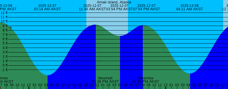 2025-12-06 06:40 PM AKST 9.86 feet High Tide 2025-12-06 06:55 PM AKST Moonrise 2025-12-07 03:14 AM AKST -2.24 feet Low Tide 2025-12-07 10:05 AM AKST Sunrise 2025-12-07 11:40 AM AKST 9.29 feet High Tide 2025-12-07 01:26 PM AKST Moonset 2025-12-07 03:54 PM AKST 6.72 feet Low Tide 2025-12-07 05:22 PM AKST Sunset 2025-12-07 07:54 PM AKST 9.16 feet High Tide 2025-12-07 08:31 PM AKST Moonrise 2025-12-08 04:11 AM AKST -1.83 feet Low Tide 2025-12-08 10:06 AM AKST Sunrise 2025-12-08 12:19 PM AKST 9.46 feet High Tide 2025-12-08 01:44 PM AKST Moonset 2025-12-08 05:22 PM AKST Sunset 2025-12-08 05:24 PM AKST 5.96 feet Low Tide 2025-12-08 09:17 PM AKST 8.28 feet High Tide 2025-12-08 10:06 PM AKST Moonrise 2025-12-09 05:07 AM AKST -1.19 feet Low Tide 2025-12-09 10:08 AM AKST Sunrise 2025-12-09 12:55 PM AKST 9.52 feet High Tide 2025-12-09 01:56 PM AKST Moonset 2025-12-09 05:21 PM AKST Sunset 2025-12-09 06:41 PM AKST 4.95 feet Low Tide 2025-12-09 10:46 PM AKST 7.35 feet High Tide 2025-12-09 11:35 PM AKST Moonrise 2025-12-10 06:00 AM AKST -0.35 feet Low Tide 2025-12-10 10:09 AM AKST Sunrise 2025-12-10 01:30 PM AKST 9.48 feet High Tide 2025-12-10 02:04 PM AKST Moonset 2025-12-10 05:21 PM AKST Sunset |