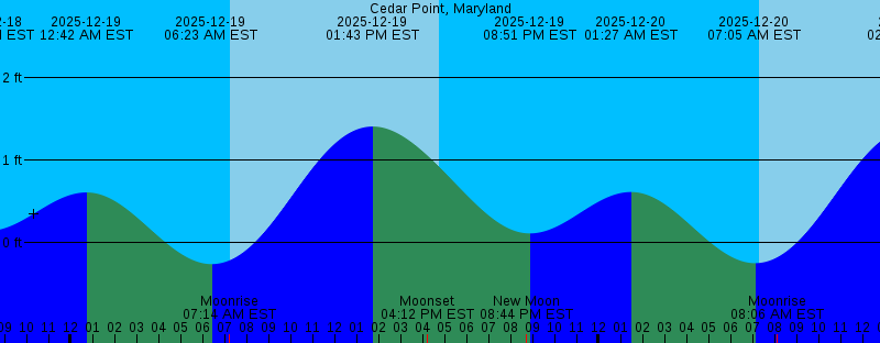 2025-12-18 03:24 PM EST Moonset 2025-12-18 04:47 PM EST Sunset 2025-12-18 08:13 PM EST 0.14 feet Low Tide 2025-12-19 12:42 AM EST 0.61 feet High Tide 2025-12-19 06:23 AM EST -0.26 feet Low Tide 2025-12-19 07:14 AM EST Moonrise 2025-12-19 07:17 AM EST Sunrise 2025-12-19 01:43 PM EST 1.41 feet High Tide 2025-12-19 04:12 PM EST Moonset 2025-12-19 04:47 PM EST Sunset 2025-12-19 08:44 PM EST New Moon 2025-12-19 08:51 PM EST 0.11 feet Low Tide 2025-12-20 01:27 AM EST 0.62 feet High Tide 2025-12-20 07:05 AM EST -0.25 feet Low Tide 2025-12-20 07:18 AM EST Sunrise 2025-12-20 08:06 AM EST Moonrise 2025-12-20 02:18 PM EST 1.39 feet High Tide 2025-12-20 04:48 PM EST Sunset 2025-12-20 05:07 PM EST Moonset 2025-12-20 09:26 PM EST 0.09 feet Low Tide 2025-12-21 02:10 AM EST 0.63 feet High Tide 2025-12-21 07:18 AM EST Sunrise 2025-12-21 07:48 AM EST -0.23 feet Low Tide 2025-12-21 08:51 AM EST Moonrise 2025-12-21 02:53 PM EST 1.38 feet High Tide 2025-12-21 04:48 PM EST Sunset 2025-12-21 06:08 PM EST Moonset 2025-12-21 10:01 PM EST 0.07 feet Low Tide 2025-12-22 02:53 AM EST 0.65 feet High Tide 2025-12-22 07:19 AM EST Sunrise 2025-12-22 08:32 AM EST -0.22 feet Low Tide 2025-12-22 09:29 AM EST Moonrise |