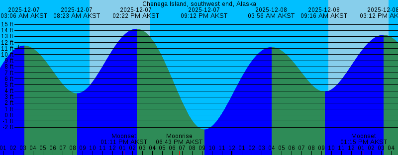 2025-12-07 03:06 AM AKST 11.49 feet High Tide 2025-12-07 08:23 AM AKST 3.61 feet Low Tide 2025-12-07 09:42 AM AKST Sunrise 2025-12-07 01:11 PM AKST Moonset 2025-12-07 02:22 PM AKST 14.27 feet High Tide 2025-12-07 03:45 PM AKST Sunset 2025-12-07 06:43 PM AKST Moonrise 2025-12-07 09:12 PM AKST -2.36 feet Low Tide 2025-12-08 03:56 AM AKST 11.25 feet High Tide 2025-12-08 09:16 AM AKST 3.89 feet Low Tide 2025-12-08 09:43 AM AKST Sunrise 2025-12-08 01:15 PM AKST Moonset 2025-12-08 03:12 PM AKST 13.28 feet High Tide 2025-12-08 03:45 PM AKST Sunset 2025-12-08 08:33 PM AKST Moonrise 2025-12-08 10:01 PM AKST -1.43 feet Low Tide 2025-12-09 04:49 AM AKST 10.96 feet High Tide 2025-12-09 09:45 AM AKST Sunrise 2025-12-09 10:12 AM AKST 4.19 feet Low Tide 2025-12-09 01:16 PM AKST Moonset 2025-12-09 03:44 PM AKST Sunset 2025-12-09 04:05 PM AKST 12.00 feet High Tide 2025-12-09 10:14 PM AKST Moonrise 2025-12-09 10:50 PM AKST -0.33 feet Low Tide 2025-12-10 05:45 AM AKST 10.74 feet High Tide 2025-12-10 09:46 AM AKST Sunrise 2025-12-10 11:12 AM AKST 4.42 feet Low Tide 2025-12-10 01:15 PM AKST Moonset 2025-12-10 03:44 PM AKST Sunset 2025-12-10 05:09 PM AKST 10.65 feet High Tide |