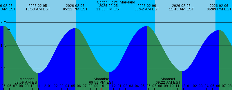 2026-02-05 05:22 PM EST 1.75 feet High Tide 2026-02-05 05:34 PM EST Sunset 2026-02-05 09:51 PM EST Moonrise 2026-02-05 11:06 PM EST -0.14 feet Low Tide 2026-02-06 05:42 AM EST 1.84 feet High Tide 2026-02-06 07:07 AM EST Sunrise 2026-02-06 09:22 AM EST Moonset 2026-02-06 11:40 AM EST -0.10 feet Low Tide 2026-02-06 05:35 PM EST Sunset 2026-02-06 06:09 PM EST 1.67 feet High Tide 2026-02-06 10:53 PM EST Moonrise 2026-02-06 11:42 PM EST -0.08 feet Low Tide 2026-02-07 06:26 AM EST 1.81 feet High Tide 2026-02-07 07:06 AM EST Sunrise 2026-02-07 09:46 AM EST Moonset 2026-02-07 12:27 PM EST -0.01 feet Low Tide 2026-02-07 05:36 PM EST Sunset 2026-02-07 06:58 PM EST 1.58 feet High Tide 2026-02-07 11:55 PM EST Moonrise 2026-02-08 12:17 AM EST -0.01 feet Low Tide 2026-02-08 07:05 AM EST Sunrise 2026-02-08 07:13 AM EST 1.77 feet High Tide 2026-02-08 10:12 AM EST Moonset 2026-02-08 01:15 PM EST 0.07 feet Low Tide 2026-02-08 05:37 PM EST Sunset 2026-02-08 07:49 PM EST 1.51 feet High Tide 2026-02-09 12:55 AM EST 0.04 feet Low Tide 2026-02-09 12:56 AM EST Moonrise 2026-02-09 07:03 AM EST Sunrise 2026-02-09 07:44 AM EST Last Quarter 2026-02-09 08:01 AM EST 1.71 feet High Tide 2026-02-09 10:42 AM EST Moonset |