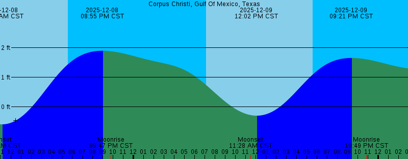 2025-12-08 10:49 AM CST Moonset 2025-12-08 11:04 AM CST -0.59 feet Low Tide 2025-12-08 05:34 PM CST Sunset 2025-12-08 08:55 PM CST 1.90 feet High Tide 2025-12-08 09:47 PM CST Moonrise 2025-12-09 07:07 AM CST Sunrise 2025-12-09 11:28 AM CST Moonset 2025-12-09 12:02 PM CST -0.30 feet Low Tide 2025-12-09 05:34 PM CST Sunset 2025-12-09 09:21 PM CST 1.66 feet High Tide 2025-12-09 10:49 PM CST Moonrise 2025-12-10 07:08 AM CST Sunrise 2025-12-10 12:01 PM CST Moonset 2025-12-10 01:02 PM CST 0.04 feet Low Tide 2025-12-10 05:34 PM CST Sunset 2025-12-10 09:24 PM CST 1.43 feet High Tide 2025-12-10 11:47 PM CST Moonrise 2025-12-11 04:08 AM CST 1.01 feet Low Tide 2025-12-11 06:27 AM CST 1.04 feet High Tide 2025-12-11 07:09 AM CST Sunrise 2025-12-11 12:31 PM CST Moonset 2025-12-11 02:08 PM CST 0.40 feet Low Tide 2025-12-11 02:52 PM CST Last Quarter 2025-12-11 05:35 PM CST Sunset 2025-12-11 09:17 PM CST 1.25 feet High Tide 2025-12-12 12:43 AM CST Moonrise 2025-12-12 04:14 AM CST 0.70 feet Low Tide 2025-12-12 07:09 AM CST Sunrise 2025-12-12 09:17 AM CST 1.00 feet High Tide |
