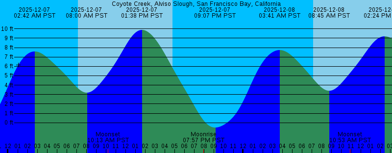 2025-12-07 02:41 AM PST 7.59 feet High Tide 2025-12-07 07:09 AM PST Sunrise 2025-12-07 08:00 AM PST 3.20 feet Low Tide 2025-12-07 10:13 AM PST Moonset 2025-12-07 01:38 PM PST 9.89 feet High Tide 2025-12-07 04:49 PM PST Sunset 2025-12-07 07:57 PM PST Moonrise 2025-12-07 09:07 PM PST -0.52 feet Low Tide 2025-12-08 03:41 AM PST 7.74 feet High Tide 2025-12-08 07:10 AM PST Sunrise 2025-12-08 08:45 AM PST 3.40 feet Low Tide 2025-12-08 10:53 AM PST Moonset 2025-12-08 02:24 PM PST 9.20 feet High Tide 2025-12-08 04:49 PM PST Sunset 2025-12-08 09:10 PM PST Moonrise 2025-12-08 09:46 PM PST -0.39 feet Low Tide 2025-12-09 04:37 AM PST 7.91 feet High Tide 2025-12-09 07:11 AM PST Sunrise 2025-12-09 09:32 AM PST 3.67 feet Low Tide 2025-12-09 11:25 AM PST Moonset 2025-12-09 03:25 PM PST 8.41 feet High Tide 2025-12-09 04:49 PM PST Sunset 2025-12-09 10:19 PM PST Moonrise 2025-12-09 10:32 PM PST -0.09 feet Low Tide 2025-12-10 05:26 AM PST 8.01 feet High Tide 2025-12-10 07:12 AM PST Sunrise 2025-12-10 10:26 AM PST 3.84 feet Low Tide 2025-12-10 11:52 AM PST Moonset 2025-12-10 04:50 PM PST Sunset 2025-12-10 04:50 PM PST 7.79 feet High Tide |