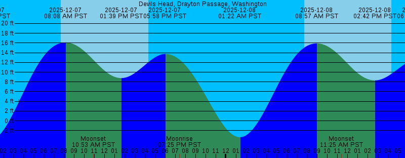 2025-12-07 12:33 AM PST -4.18 feet Low Tide 2025-12-07 07:43 AM PST Sunrise 2025-12-07 08:08 AM PST 16.11 feet High Tide 2025-12-07 10:53 AM PST Moonset 2025-12-07 01:39 PM PST 8.78 feet Low Tide 2025-12-07 04:21 PM PST Sunset 2025-12-07 05:58 PM PST 13.73 feet High Tide 2025-12-07 07:25 PM PST Moonrise 2025-12-08 01:22 AM PST -3.37 feet Low Tide 2025-12-08 07:44 AM PST Sunrise 2025-12-08 08:57 AM PST 15.91 feet High Tide 2025-12-08 11:25 AM PST Moonset 2025-12-08 02:42 PM PST 8.31 feet Low Tide 2025-12-08 04:21 PM PST Sunset 2025-12-08 06:57 PM PST 12.70 feet High Tide 2025-12-08 08:47 PM PST Moonrise 2025-12-09 02:11 AM PST -2.15 feet Low Tide 2025-12-09 07:45 AM PST Sunrise 2025-12-09 09:45 AM PST 15.64 feet High Tide 2025-12-09 11:49 AM PST Moonset 2025-12-09 03:51 PM PST 7.58 feet Low Tide 2025-12-09 04:21 PM PST Sunset 2025-12-09 08:03 PM PST 11.50 feet High Tide 2025-12-09 10:05 PM PST Moonrise 2025-12-10 03:02 AM PST -0.60 feet Low Tide 2025-12-10 07:46 AM PST Sunrise 2025-12-10 10:30 AM PST 15.36 feet High Tide 2025-12-10 12:07 PM PST Moonset 2025-12-10 04:21 PM PST Sunset 2025-12-10 05:03 PM PST 6.56 feet Low Tide 2025-12-10 09:19 PM PST 10.33 feet High Tide |