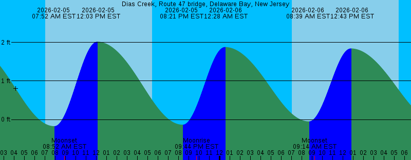 2026-02-05 07:02 AM EST Sunrise 2026-02-05 07:52 AM EST -0.17 feet Low Tide 2026-02-05 08:51 AM EST Moonset 2026-02-05 12:03 PM EST 2.02 feet High Tide 2026-02-05 05:25 PM EST Sunset 2026-02-05 08:21 PM EST -0.13 feet Low Tide 2026-02-05 09:44 PM EST Moonrise 2026-02-06 12:28 AM EST 1.88 feet High Tide 2026-02-06 07:01 AM EST Sunrise 2026-02-06 08:39 AM EST -0.05 feet Low Tide 2026-02-06 09:14 AM EST Moonset 2026-02-06 12:43 PM EST 1.84 feet High Tide 2026-02-06 05:26 PM EST Sunset 2026-02-06 09:01 PM EST -0.03 feet Low Tide 2026-02-06 10:46 PM EST Moonrise 2026-02-07 01:12 AM EST 1.84 feet High Tide 2026-02-07 07:00 AM EST Sunrise 2026-02-07 09:28 AM EST 0.09 feet Low Tide 2026-02-07 09:37 AM EST Moonset 2026-02-07 01:25 PM EST 1.67 feet High Tide 2026-02-07 05:27 PM EST Sunset 2026-02-07 09:41 PM EST 0.08 feet Low Tide 2026-02-07 11:49 PM EST Moonrise 2026-02-08 01:58 AM EST 1.79 feet High Tide 2026-02-08 06:59 AM EST Sunrise 2026-02-08 10:02 AM EST Moonset 2026-02-08 10:20 AM EST 0.21 feet Low Tide 2026-02-08 02:11 PM EST 1.50 feet High Tide 2026-02-08 05:28 PM EST Sunset 2026-02-08 10:26 PM EST 0.18 feet Low Tide 2026-02-09 12:51 AM EST Moonrise 2026-02-09 02:48 AM EST 1.74 feet High Tide |