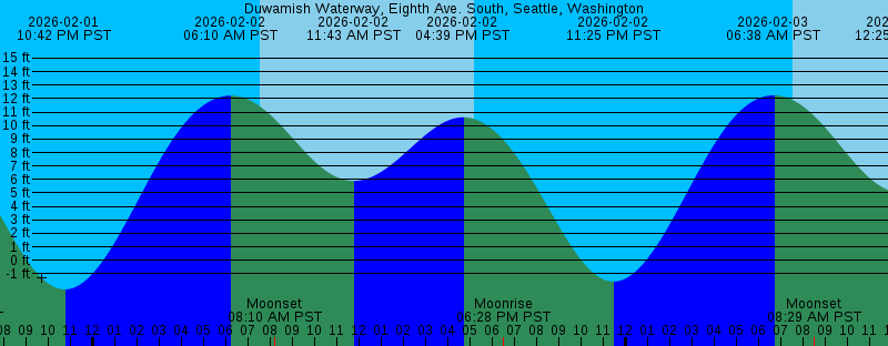 2026-02-01 10:42 PM PST -2.16 feet Low Tide 2026-02-02 06:10 AM PST 12.22 feet High Tide 2026-02-02 07:34 AM PST Sunrise 2026-02-02 08:10 AM PST Moonset 2026-02-02 11:43 AM PST 5.89 feet Low Tide 2026-02-02 04:39 PM PST 10.61 feet High Tide 2026-02-02 05:12 PM PST Sunset 2026-02-02 06:28 PM PST Moonrise 2026-02-02 11:25 PM PST -1.58 feet Low Tide 2026-02-03 06:38 AM PST 12.25 feet High Tide 2026-02-03 07:32 AM PST Sunrise 2026-02-03 08:29 AM PST Moonset 2026-02-03 12:25 PM PST 5.01 feet Low Tide 2026-02-03 05:14 PM PST Sunset 2026-02-03 05:33 PM PST 10.26 feet High Tide 2026-02-03 07:45 PM PST Moonrise 2026-02-04 12:06 AM PST -0.62 feet Low Tide 2026-02-04 07:05 AM PST 12.22 feet High Tide 2026-02-04 07:31 AM PST Sunrise 2026-02-04 08:45 AM PST Moonset 2026-02-04 01:08 PM PST 4.14 feet Low Tide 2026-02-04 05:15 PM PST Sunset 2026-02-04 06:27 PM PST 9.79 feet High Tide 2026-02-04 08:59 PM PST Moonrise 2026-02-05 12:46 AM PST 0.65 feet Low Tide 2026-02-05 07:29 AM PST Sunrise 2026-02-05 07:32 AM PST 12.10 feet High Tide 2026-02-05 09:00 AM PST Moonset 2026-02-05 01:50 PM PST 3.34 feet Low Tide 2026-02-05 05:17 PM PST Sunset 2026-02-05 07:24 PM PST 9.28 feet High Tide |