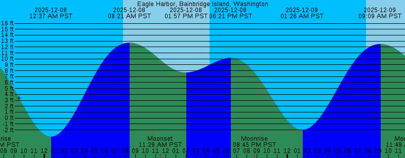 2025-12-07 10:54 AM PST Moonset 2025-12-07 12:54 PM PST 8.15 feet Low Tide 2025-12-07 04:18 PM PST Sunset 2025-12-07 05:22 PM PST 10.99 feet High Tide 2025-12-07 07:22 PM PST Moonrise 2025-12-08 12:37 AM PST -3.12 feet Low Tide 2025-12-08 07:45 AM PST Sunrise 2025-12-08 08:21 AM PST 12.73 feet High Tide 2025-12-08 11:26 AM PST Moonset 2025-12-08 01:57 PM PST 7.71 feet Low Tide 2025-12-08 04:18 PM PST Sunset 2025-12-08 06:21 PM PST 10.16 feet High Tide 2025-12-08 08:45 PM PST Moonrise 2025-12-09 01:26 AM PST -1.99 feet Low Tide 2025-12-09 07:46 AM PST Sunrise 2025-12-09 09:09 AM PST 12.51 feet High Tide 2025-12-09 11:49 AM PST Moonset 2025-12-09 03:06 PM PST 7.03 feet Low Tide 2025-12-09 04:18 PM PST Sunset 2025-12-09 07:27 PM PST 9.20 feet High Tide 2025-12-09 10:03 PM PST Moonrise 2025-12-10 02:17 AM PST -0.56 feet Low Tide 2025-12-10 07:47 AM PST Sunrise 2025-12-10 09:54 AM PST 12.29 feet High Tide 2025-12-10 12:07 PM PST Moonset 2025-12-10 04:18 PM PST Sunset 2025-12-10 04:18 PM PST 6.08 feet Low Tide 2025-12-10 08:43 PM PST 8.27 feet High Tide 2025-12-10 11:16 PM PST Moonrise 2025-12-11 03:09 AM PST 1.10 feet Low Tide 2025-12-11 07:48 AM PST Sunrise |