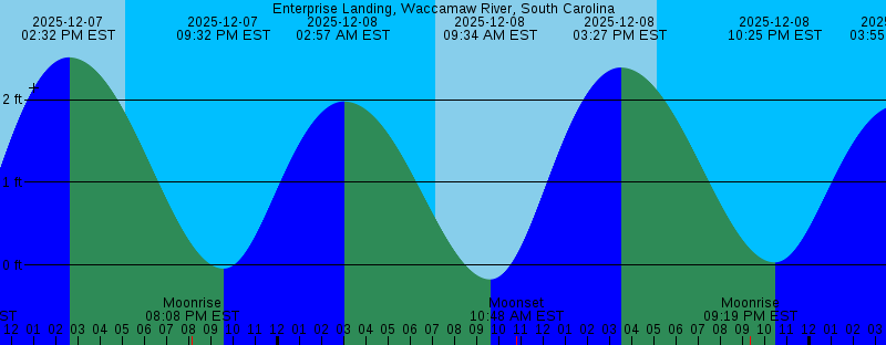 2025-12-07 07:07 AM EST Sunrise 2025-12-07 08:40 AM EST -0.27 feet Low Tide 2025-12-07 10:04 AM EST Moonset 2025-12-07 02:32 PM EST 2.51 feet High Tide 2025-12-07 05:07 PM EST Sunset 2025-12-07 08:08 PM EST Moonrise 2025-12-07 09:32 PM EST -0.04 feet Low Tide 2025-12-08 02:57 AM EST 1.98 feet High Tide 2025-12-08 07:08 AM EST Sunrise 2025-12-08 09:34 AM EST -0.17 feet Low Tide 2025-12-08 10:48 AM EST Moonset 2025-12-08 03:27 PM EST 2.39 feet High Tide 2025-12-08 05:07 PM EST Sunset 2025-12-08 09:19 PM EST Moonrise 2025-12-08 10:25 PM EST 0.03 feet Low Tide 2025-12-09 03:55 AM EST 1.93 feet High Tide 2025-12-09 07:09 AM EST Sunrise 2025-12-09 10:29 AM EST -0.05 feet Low Tide 2025-12-09 11:23 AM EST Moonset 2025-12-09 04:22 PM EST 2.25 feet High Tide 2025-12-09 05:07 PM EST Sunset 2025-12-09 10:25 PM EST Moonrise 2025-12-09 11:18 PM EST 0.10 feet Low Tide 2025-12-10 04:53 AM EST 1.89 feet High Tide 2025-12-10 07:10 AM EST Sunrise 2025-12-10 11:27 AM EST 0.08 feet Low Tide 2025-12-10 11:53 AM EST Moonset 2025-12-10 05:08 PM EST Sunset 2025-12-10 05:15 PM EST 2.11 feet High Tide 2025-12-10 11:27 PM EST Moonrise 2025-12-11 12:12 AM EST 0.16 feet Low Tide |