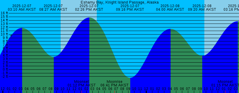2025-12-07 03:10 AM AKST 11.83 feet High Tide 2025-12-07 08:27 AM AKST 3.61 feet Low Tide 2025-12-07 09:42 AM AKST Sunrise 2025-12-07 01:12 PM AKST Moonset 2025-12-07 02:26 PM AKST 14.79 feet High Tide 2025-12-07 03:43 PM AKST Sunset 2025-12-07 06:41 PM AKST Moonrise 2025-12-07 09:16 PM AKST -2.36 feet Low Tide 2025-12-08 04:00 AM AKST 11.57 feet High Tide 2025-12-08 09:20 AM AKST 3.89 feet Low Tide 2025-12-08 09:44 AM AKST Sunrise 2025-12-08 01:15 PM AKST Moonset 2025-12-08 03:16 PM AKST 13.72 feet High Tide 2025-12-08 03:43 PM AKST Sunset 2025-12-08 08:32 PM AKST Moonrise 2025-12-08 10:05 PM AKST -1.43 feet Low Tide 2025-12-09 04:53 AM AKST 11.26 feet High Tide 2025-12-09 09:46 AM AKST Sunrise 2025-12-09 10:16 AM AKST 4.19 feet Low Tide 2025-12-09 01:16 PM AKST Moonset 2025-12-09 03:42 PM AKST Sunset 2025-12-09 04:09 PM AKST 12.37 feet High Tide 2025-12-09 10:13 PM AKST Moonrise 2025-12-09 10:54 PM AKST -0.33 feet Low Tide 2025-12-10 05:49 AM AKST 11.03 feet High Tide 2025-12-10 09:47 AM AKST Sunrise 2025-12-10 11:16 AM AKST 4.42 feet Low Tide 2025-12-10 01:15 PM AKST Moonset 2025-12-10 03:42 PM AKST Sunset 2025-12-10 05:13 PM AKST 10.93 feet High Tide |