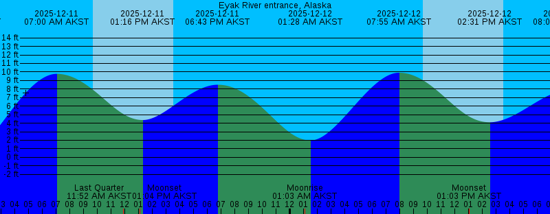 2025-12-09 04:22 PM AKST 11.17 feet High Tide 2025-12-09 10:03 PM AKST Moonrise 2025-12-09 11:48 PM AKST -0.43 feet Low Tide 2025-12-10 06:02 AM AKST 9.83 feet High Tide 2025-12-10 09:38 AM AKST Sunrise 2025-12-10 12:10 PM AKST 4.32 feet Low Tide 2025-12-10 01:06 PM AKST Moonset 2025-12-10 03:32 PM AKST Sunset 2025-12-10 05:26 PM AKST 9.73 feet High Tide 2025-12-10 11:36 PM AKST Moonrise 2025-12-11 12:37 AM AKST 0.78 feet Low Tide 2025-12-11 07:00 AM AKST 9.78 feet High Tide 2025-12-11 09:39 AM AKST Sunrise 2025-12-11 11:52 AM AKST Last Quarter 2025-12-11 01:04 PM AKST Moonset 2025-12-11 01:16 PM AKST 4.37 feet Low Tide 2025-12-11 03:32 PM AKST Sunset 2025-12-11 06:43 PM AKST 8.50 feet High Tide 2025-12-12 01:03 AM AKST Moonrise 2025-12-12 01:28 AM AKST 1.98 feet Low Tide 2025-12-12 07:55 AM AKST 9.91 feet High Tide 2025-12-12 09:41 AM AKST Sunrise 2025-12-12 01:03 PM AKST Moonset 2025-12-12 02:31 PM AKST 4.11 feet Low Tide 2025-12-12 03:31 PM AKST Sunset 2025-12-12 08:03 PM AKST 7.77 feet High Tide 2025-12-13 02:23 AM AKST 3.09 feet Low Tide 2025-12-13 02:29 AM AKST Moonrise 2025-12-13 08:43 AM AKST 10.16 feet High Tide 2025-12-13 09:42 AM AKST Sunrise 2025-12-13 01:01 PM AKST Moonset 2025-12-13 03:31 PM AKST Sunset 2025-12-13 03:52 PM AKST 3.43 feet Low Tide |