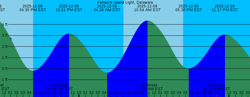 2025-12-08 04:34 PM EST -0.18 feet Low Tide 2025-12-08 04:39 PM EST Sunset 2025-12-08 08:51 PM EST Moonrise 2025-12-08 10:21 PM EST 3.18 feet High Tide 2025-12-09 04:26 AM EST -0.36 feet Low Tide 2025-12-09 07:06 AM EST Sunrise 2025-12-09 10:54 AM EST 4.35 feet High Tide 2025-12-09 11:15 AM EST Moonset 2025-12-09 04:39 PM EST Sunset 2025-12-09 05:30 PM EST 0.01 feet Low Tide 2025-12-09 10:01 PM EST Moonrise 2025-12-09 11:17 PM EST 3.09 feet High Tide 2025-12-10 05:26 AM EST -0.01 feet Low Tide 2025-12-10 07:06 AM EST Sunrise 2025-12-10 11:42 AM EST Moonset 2025-12-10 11:48 AM EST 3.95 feet High Tide 2025-12-10 04:39 PM EST Sunset 2025-12-10 06:24 PM EST 0.17 feet Low Tide 2025-12-10 11:07 PM EST Moonrise 2025-12-11 12:16 AM EST 3.04 feet High Tide 2025-12-11 06:28 AM EST 0.30 feet Low Tide 2025-12-11 07:07 AM EST Sunrise 2025-12-11 12:06 PM EST Moonset 2025-12-11 12:43 PM EST 3.57 feet High Tide 2025-12-11 03:52 PM EST Last Quarter 2025-12-11 04:39 PM EST Sunset 2025-12-11 07:16 PM EST 0.29 feet Low Tide 2025-12-12 12:09 AM EST Moonrise 2025-12-12 01:19 AM EST 3.06 feet High Tide 2025-12-12 07:08 AM EST Sunrise 2025-12-12 07:32 AM EST 0.54 feet Low Tide |