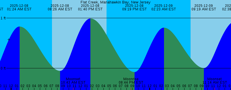 2025-12-07 04:32 PM EST Sunset 2025-12-07 07:29 PM EST Moonrise 2025-12-07 08:28 PM EST -0.12 feet Low Tide 2025-12-08 01:24 AM EST 0.83 feet High Tide 2025-12-08 07:05 AM EST Sunrise 2025-12-08 08:26 AM EST -0.05 feet Low Tide 2025-12-08 10:43 AM EST Moonset 2025-12-08 01:40 PM EST 0.99 feet High Tide 2025-12-08 04:32 PM EST Sunset 2025-12-08 08:44 PM EST Moonrise 2025-12-08 09:19 PM EST -0.08 feet Low Tide 2025-12-09 02:23 AM EST 0.81 feet High Tide 2025-12-09 07:06 AM EST Sunrise 2025-12-09 09:19 AM EST 0.00 feet Low Tide 2025-12-09 11:14 AM EST Moonset 2025-12-09 02:38 PM EST 0.93 feet High Tide 2025-12-09 04:32 PM EST Sunset 2025-12-09 09:55 PM EST Moonrise 2025-12-09 10:12 PM EST -0.03 feet Low Tide 2025-12-10 03:22 AM EST 0.79 feet High Tide 2025-12-10 07:07 AM EST Sunrise 2025-12-10 10:16 AM EST 0.06 feet Low Tide 2025-12-10 11:40 AM EST Moonset 2025-12-10 03:34 PM EST 0.87 feet High Tide 2025-12-10 04:32 PM EST Sunset 2025-12-10 11:02 PM EST Moonrise 2025-12-10 11:08 PM EST 0.01 feet Low Tide 2025-12-11 04:17 AM EST 0.79 feet High Tide 2025-12-11 07:07 AM EST Sunrise 2025-12-11 11:19 AM EST 0.12 feet Low Tide 2025-12-11 12:03 PM EST Moonset |